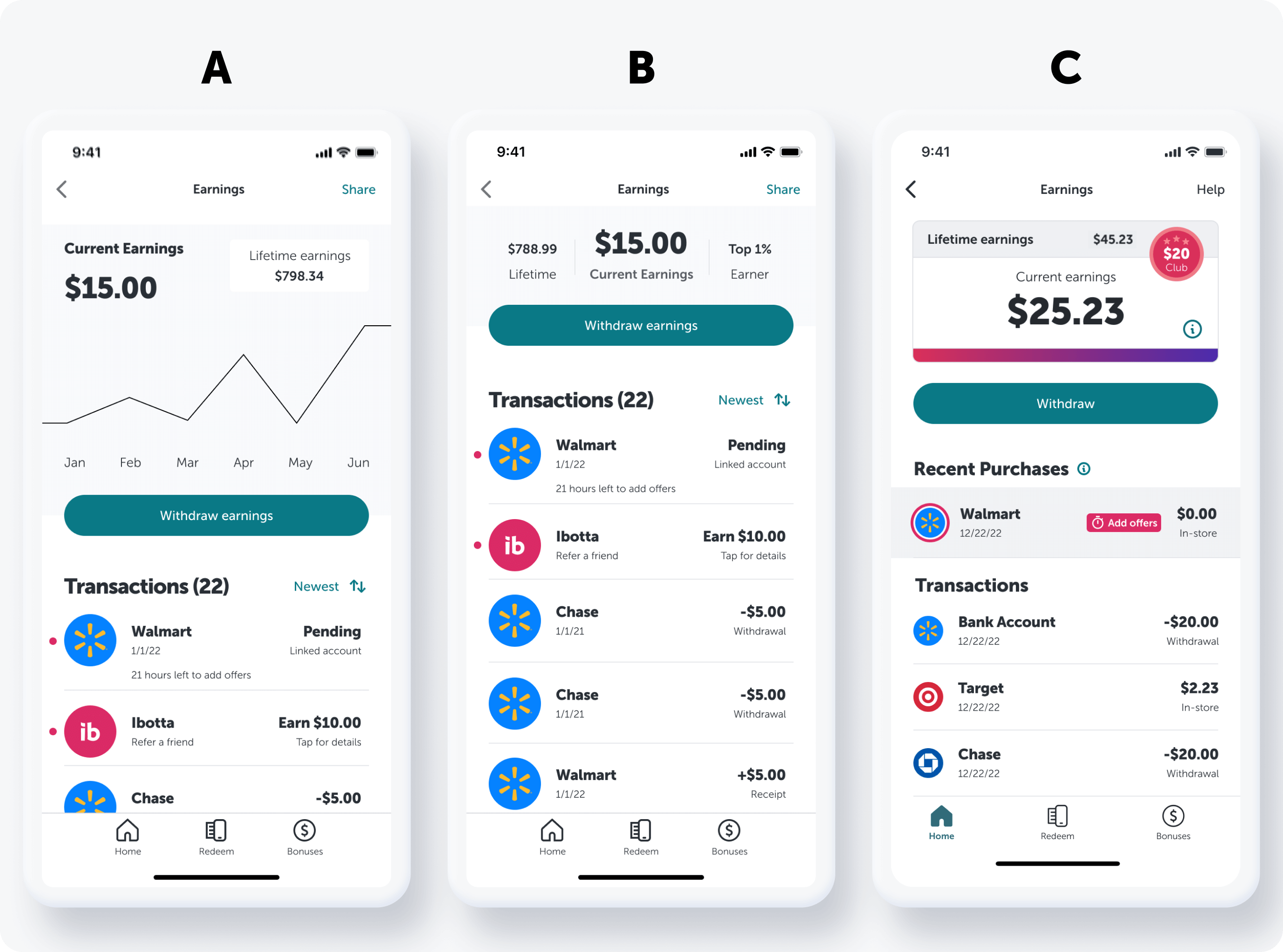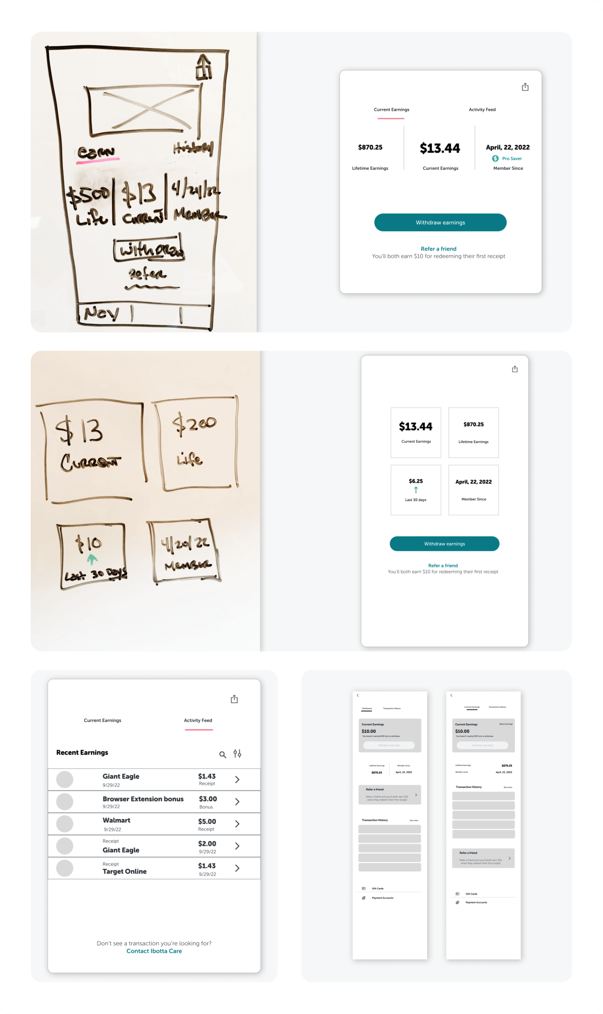 I created three distinct UI concepts for the dashboard view and ran qualitative A/B/C testing with 6 Ibotta users.