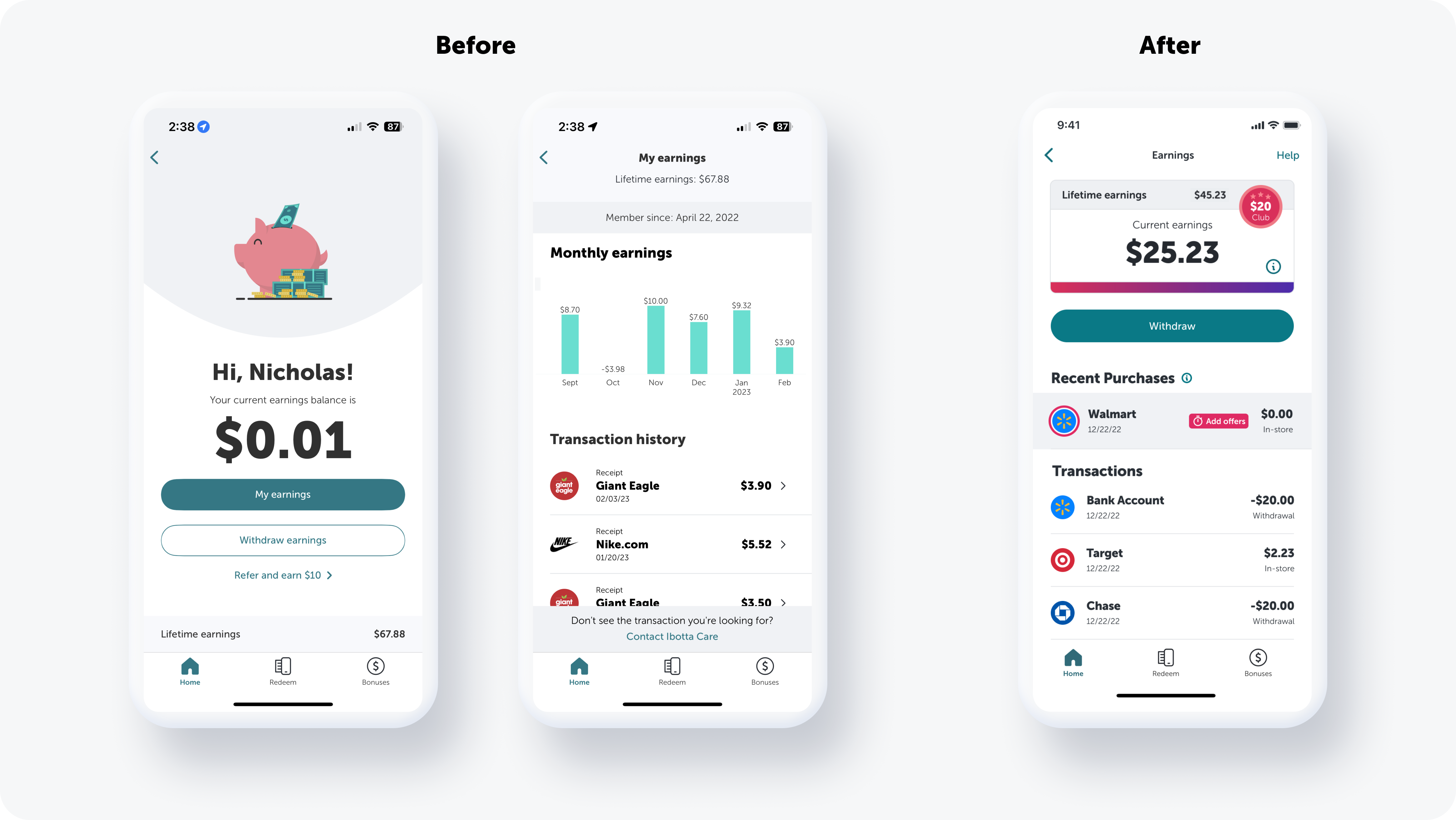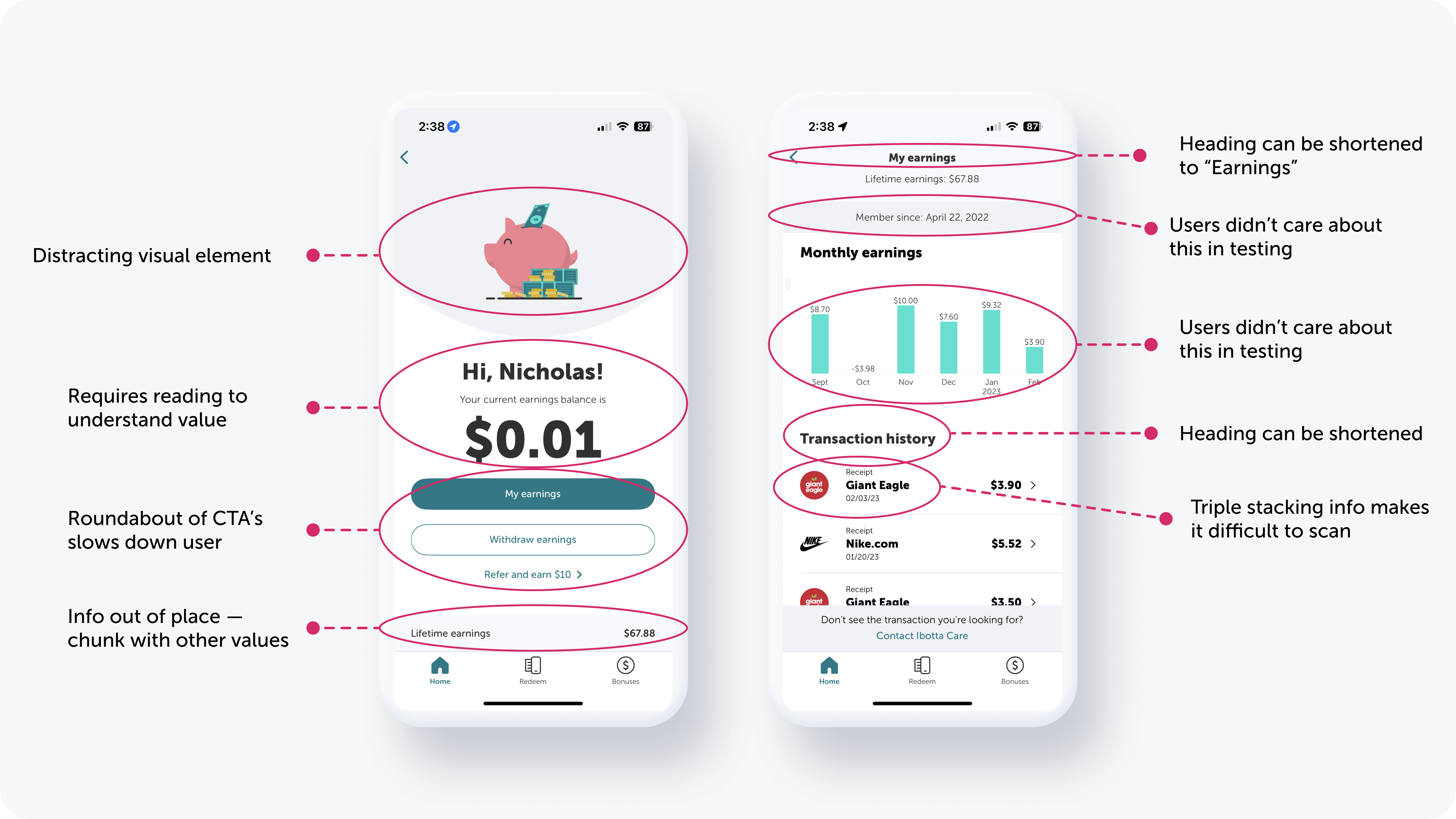 Patterns emerged around visual communication: effective use of infographics inspired a revamp of Ibotta’s bar chart and the addition of a progress bar to clearly indicate progress toward the $20 minimum withdrawal threshold.