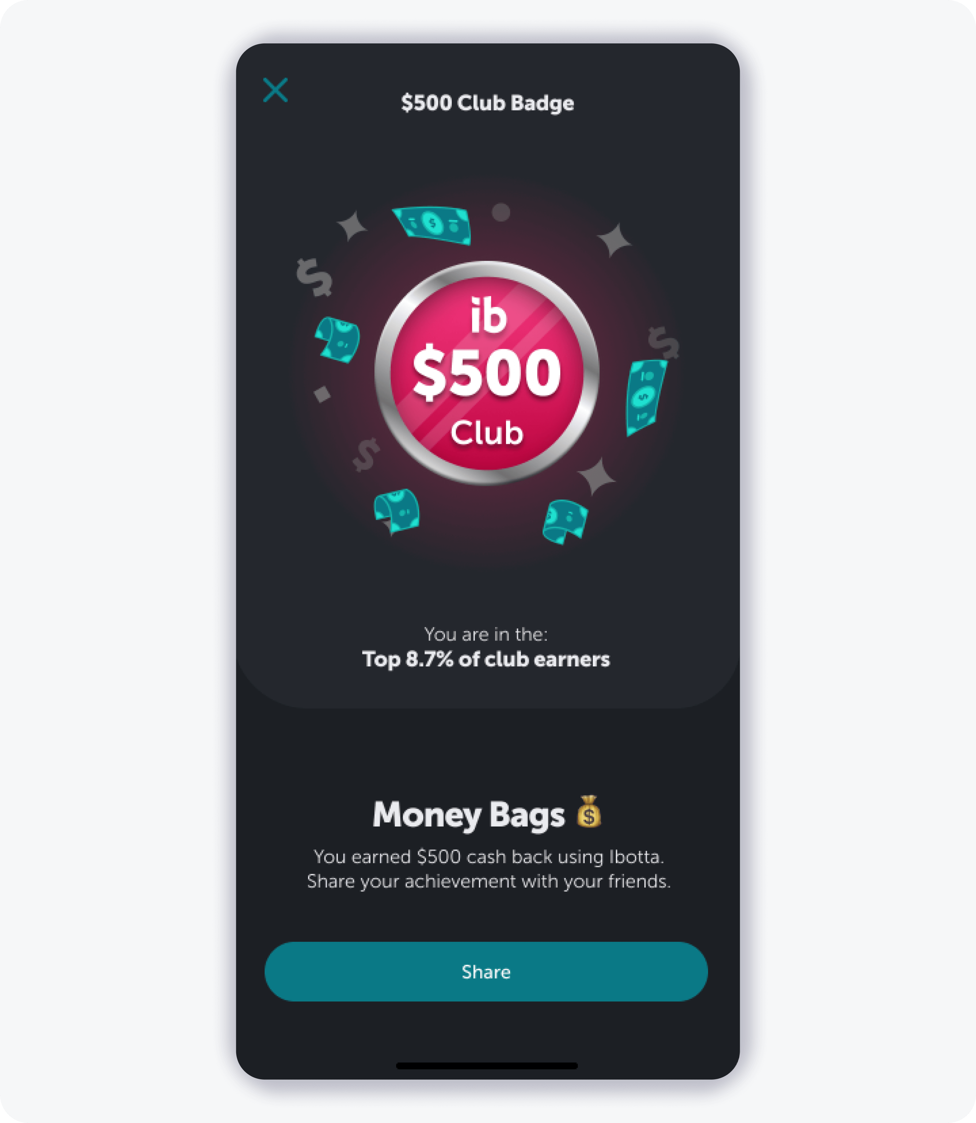 I designed Earning's Club overlays for $25, $50, $100, $500, $1,000, and higher tiers, giving users a clear, motivating visual of their progress. Users can tap a club chip to share achievements with friends, fostering friendly competition and social engagement, even while a full leaderboard remained out of scope.