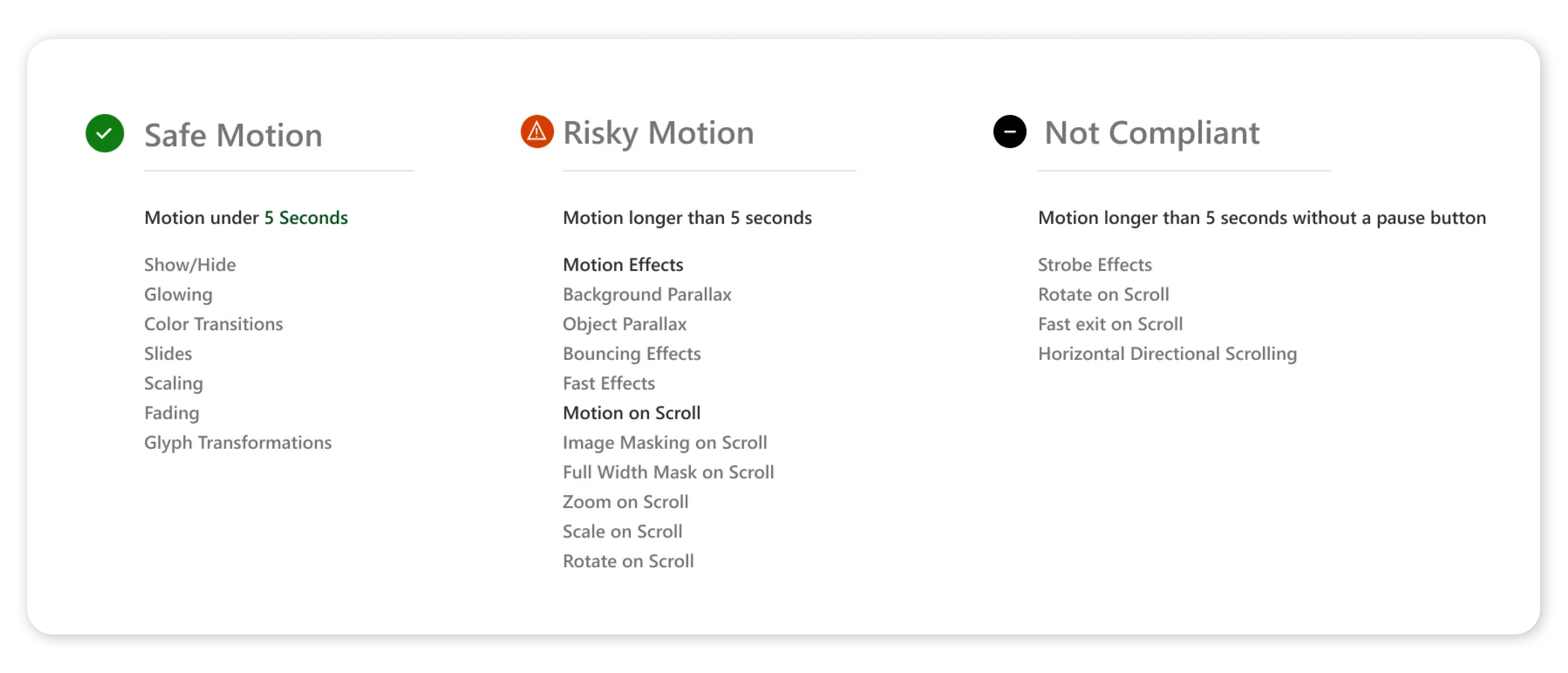 Motion Tiering: Developed a traffic-light system (Safe/Risky/Non-Compliant) to categorize animation types based on screen real estate, velocity, and flashing ratios.